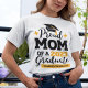 Celebrate your son's or daughter's graduation with this modern t-shirt featuring a "Proud MOM of a 2024 Graduate" typography in black and gold fonts decorated with a black grad cap with a golden tassel; easily customize this t-shirt with the graduation year and the name of the graduate by editing the template fields.