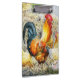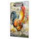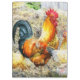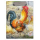 A barnyard rooster framed by a bevy of his lady hens and hay in soft focus around him. The gentle yellows and grays bring the colorful rooster into the center of attention, right where the proud bird likes to be. This is a mixed media drawing in oil pastel and colored pencil. By Amanda Diehl, Paxdomino Designs