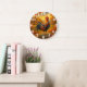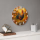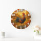 Rustic farmhouse clock showcases a vibrant rooster (orange/red/black plumage) standing tall on rocks at dusk, with thatched cottages, wooden fences, and red-leafed trees. White numerals on warm-toned backdrop create cozy pastoral charm—perfect for kitchen decor or Thanksgiving gifts.
