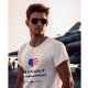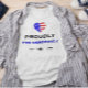 Heart with an American flag design at the top of the design. "Proudly" is written below that in bold, black typeface, with "Pro-Democracy" written below that in bold, blue letters. Beneath that is a small black star with lines on each side. Available in mens or womens sizes and various styles.