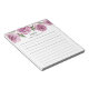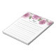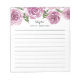 Chic floral notepad features a top border of purple and burgundy watercolor roses and green leaves. Personalize with two lines of custom text in modern block and calligraphy lettering; shown with the French greeting "bonjour" and your name. Lined.