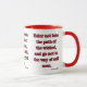 This two-tone mug features a typograph design that has a Vidaloka print font with red colored letters, black outline displaying the "Proverbs 4:14" KJV bible scripture verse over a white background in this faith based theme. This verse is referencing the Book Of Proverbs 4th chapter showing the 14th verse of this bible scripture quote theme from the King James bible. The rim & handle are glazed in matching colors available in 11-ounce or 15-ounce sizes microwave and dishwasher safe ceramic construction.