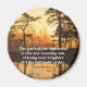 Inspirational quote scripture magnet depicts a beautiful nature photograph with the sun shining through trees in the forest and reflected in the water. It features Bible Verse Proverbs 4:18, "The path of the righteous is like the morning sun, shining ever brighter till the full light of day."