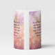 This pillar candle features an agrandir wide print font with purple letters showcasing the "Psalm 127:3 KJV" bible scripture verse over a background picture displaying a upclose dim view of a field full of wild flowers with a purple colored look in this floral theme. This verse is referencing the Book Of Psalm 127th chapter showing the 3rd verse in this bible scripture quote theme from the King James bible. The candle is covered with a beautiful full-color wrap hand poured, individually designed made with high grade American paraffin & beeswax and, burns approximately 40 hours made in the USA.
