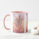 This two-tone mug features an agrandir wide print font with purple letters showcasing the "Psalm 127:3 KJV" bible scripture verse over a background picture displaying a upclose dim view of a field full of wild flowers with a purple colored look in this floral theme. This verse is referencing the Book Of Psalm 127th chapter showing the 3rd verse in this bible scripture quote theme from the King James bible. The rim & handle are glazed in matching colors available in 11-ounce or 15-ounce sizes microwave and dishwasher safe ceramic construction.