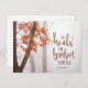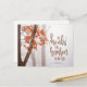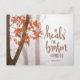 Inspirational quote scripture postcard depicts a simple nature photograph with a branch of burnt orange and red autumn leaves in a forest of trees. It features a portion of Bible Verse Psalm 147:3, "He heals the broken hearted." Photo by Simon Berger. _