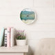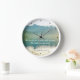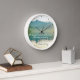 Inspirational quote scripture wall clock depicts a beautiful nature photograph of a lake surrounded by mountains. It features a portion of the beloved 23rd Psalm verses 2-3, "He leads me beside the still waters. He restores my soul."