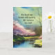 Inspirational quote scripture greeting card depicts a beautiful nature watercolor painting with a quiet stream of water lined with pink flowering trees and a blue sky. It features a portion of the beloved and encouraging Bible Verse 'The Lord is my Shepherd', Psalm 23:2-3, "He leads me beside still waters, He restores my soul." The greeting, prayer can be customized or deleted for a hand written message.