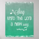 Psalms Sing Bible Verse Poster Prints with beautiful ombre green aqua background, white typography and music notes. Scripture from Psalms 98.1. See more at Christian Quotes Shop.