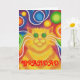 Groovy baby! A yellow and orange striped cat with swirling whiskers and a psychedelic rainbow patterned background. Greetings card with a yellow, orange, red, blue, green, pink, purple, and white customizable design for you to personalise with your own text, images and ideas.An original digitally enhanced coloured pencil drawing by Jess Perry.