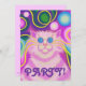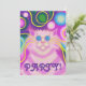 Groovy baby! A pink striped cat with swirling whiskers and a psychedelic rainbow patterned background. Invitation with a pink, blue, green, purple and yellow customizable design for you to personalise with your own text, images and ideas. The text can easily be changed using the template provided or click the 'Customize It' button to make further alterations. An original digitally enhanced coloured pencil drawing by Jess Perry.