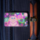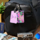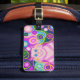 Groovy baby! A pink striped cat with swirling whiskers and a psychedelic rainbow patterned background. Luggage tag with a pink, blue, green, purple, and yellow customizable design for you to personalise with your own text, images and ideas. An original digitally enhanced coloured pencil drawing by Jess Perry.