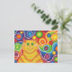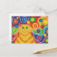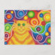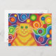 Groovy baby! A yellow and orange striped cat with swirling whiskers and a psychedelic rainbow patterned background. Postcaerd with a yellow, orange, red, blue, green, pink, purple, and white customizable design for you to personalise with your own text, images and ideas.An original digitally enhanced coloured pencil drawing by Jess Perry.