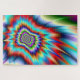 An optically challenging fractal image with a psychedelic color explosion design in red blue green and violet.
