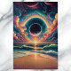 This captivating image melds the majesty of the cosmos with the serenity of a terrestrial seascape. At the horizon, a radiant sunburst pierces through a mysterious portal, surrounded by a hypnotic swirl of luminous energy. Above, a vast expanse of space unfolds, dotted with celestial bodies—planets, moons, and nebulae—all bathed in a vibrant spectrum of colors ranging from deep purples to fiery oranges and reds. The sky appears alive, swirling with clouds that mimic the shapes and hues of distant galaxies. Below, the cosmic display is mirrored in undulating waves that crash onto a serene shore, creating a harmonious blend of sky and sea, dream and reality. The artwork seamlessly bridges the vastness of the universe with the familiar beauty of our world, evoking wonder and awe.
