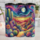 This surreal illustration depicts a vibrant desert landscape under a full moon and a swirling, colorful aurora-like sky filled with stars. Various types of cacti and desert flora in psychedelic hues populate the sandy dunes and rocky terrain, creating a dreamlike and otherworldly scene.
