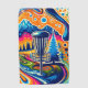 Unique ai art depicting a colorful retro colored vintage disc golf course, pine trees and mountains.