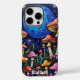 This painting showcases a whimsical and surreal landscape dominated by a variety of mushrooms with a luminescent quality. The artwork is created with a heavy impasto technique, where the thick application of paint gives the mushrooms and surrounding foliage a tangible, three-dimensional texture. The color palette is a vibrant mix of neon orange, pink, red, and blue, creating a fantastical glow that is contrasted by a darker, mysterious background. The entire scene feels both otherworldly and full of life.