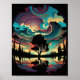 Lake landscape with tree silhouettes and psychedelic cloud skies.