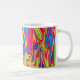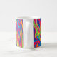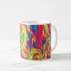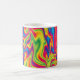 A mug featuring a colorful and abstract psychedelic design with wavy patterns.