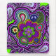 A mousepad with a colorful psychedelic design with abstract flowers, a heart, and a peace sign. It's all surrounded by purple paisley.