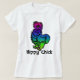 A drawing of a psychedelic colored silkie chicken with the words "Hippy Chick"
