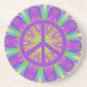 Bring out your inner hippie when you serve drinks on this round sandstone coaster with my original digitally created kaleidoscope image with the look of a tie dye in bright (almost neon) shades of purple, green, blue, yellow, orange and a multitude of other colors. In the center of the coaster is a purple peace sign.