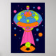 vibrant and stylized illustration featuring a multi-tiered flying saucer hovering in a dark blue space setting. The UFO itself is rendered in bold shades of blue, hot pink, neon green, and orange, with numerous circular windows and a distinctive structure on top. A wide, luminous pink beam of light emanates downwards from the base of the saucer. Suspended within this beam is a neon green cube, positioned just above an orange diamond shape outlined in black. The background is populated with scattered circular forms in various bright colors, adding to the cosmic and psychedelic atmosphere. The artwork has a flat, graphic style with strong outlines, reminiscent of retro sci-fi and pop art. (designed by freepik)