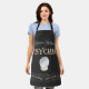 This custom apron features a mystical psychic theme over a black background. An image of a crystal ball is placed in the center, with two banners below it. A sample Palm Readings service is printed across the first banner, and Tarot Cards on the second. You can personalize the apron to include your own custom text. A sample Madame Mystique medium name is printed at the top. The word Psychic is printed in an elegant gold font. It's perfect for a Halloween gift.