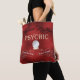 This mystical tote bag features a psychic theme over a dark red, foil style background. An image of a crystal ball is placed in the center, with two banners below it. A sample Palm Readings service is printed across the first banner, and Tarot Cards on the second. You an personalize the bag to include your own custom text. A sample Madame Mystique medium name is printed at the top. The word Psychic is printed in an elegant gold font. It makes an excellent Halloween decoration.