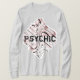 Intuition works. Let others know how "Psychic" you are with this humorous t-shirt in bold black sans serif lettering on a pink and black abstract art swirling design. Pictured here on an "ash" gray long-sleeved t-shirt in Classic Printing, with others colors and styles available.