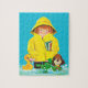 Artist: Jack Weaver | Girl with raincoat stands in puddles with frog, dog, and duck