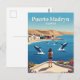 This prompt captures the essence of Puerto Madryn's unique setting. A lone traveler with a backpack is standing on the pedestrian path overlooking the cliffs of Punta Loma, just outside the town. In the midground, the deep sapphire water of the gulf fills the harbor, with stylized right whales breaching in the distance and the town's low-rise buildings nestled against the rugged Patagonian arid hills. The composition leverages the natural lines and strong graphic elements of the coast and sea, bathed in crisp, clean light.