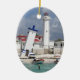 Oval ceramic ornament with an image of a lighthouse and leaning tower in Puerto Morelos, Quintana Roo, Mexico. Red back. See the entire Mexico Ornament collection in the HOME section.