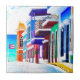 Painting of a street in San Juan, Puerto Rico with the Puerto Rican flag, colorful buildings and plants.