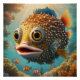 A Puffer Fish very detailed with expressive eyes is portrayed against a soft, blurred background. The natural colors enhance the lifelike appearance.