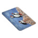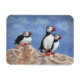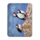 A gouache illustration of three puffins perched on a rocky cliff, set against a vibrant blue sky.