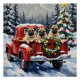 Bring wrinkly, cheerful charm to your holiday season with this adorable Pug Christmas design! This festive scene features three charming and lovable Pugs sitting contentedly in the back of a classic red pickup truck, nestled in a picturesque snowy winter forest. The vintage truck is adorned with a vibrant Christmas wreath, twinkling with red and gold ornaments and warm, glowing lights. Soft snowflakes gently fall, enhancing the winter wonderland effect. A decorated Christmas tree in the background completes this heartwarming picture, making it an ideal Christmas gift for any Pug owner, dog lover, or admirer of festive and comical dog art. This design perfectly captures the joyful spirit of the holidays.