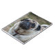 A close up photograph of a cute pug dog printed on the cover of a notebook.