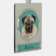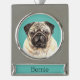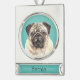 Adorable Christmas keepsake ornament features a watercolor Pug dog portrait on aqua background. Customize with name or special message
