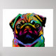 A bright and colorful pop art print of a Pug Dog on a white background.