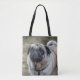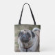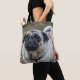 A beautiful photograph of a cute pug dog printed on both sides of a tote bag.
