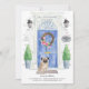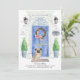 Announce your new address with our stylish announcement featuring a Pug, blue front door, welcome mat, slate sign, topiaries and a floral wreath set on a gray brick background.