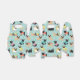 Cute birthday party Pug dogs with black and tan coats dressed in cute birthday outfits with balloons, cake and confetti pattern.
