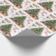 The repeated pattern on this Christmas wrapping paper includes an image of a little Pug puppy sitting in a wicker basket filled with flowers. The basket is decorated with a red bow, and sits beside a Holiday tree. Stylized red and green text says MERRY CHRISTMAS", and your own signature is in two fields for you to customize. Other images included in the pattern include red decorative snowflakes, candy canes, and a peppermint lolly pop.