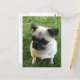 Adorable pug puppy sitting on grass, looking to the side on portrait photograph.
