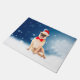 A beautiful photo of pug wearing a Christmas Santa hat and sat in snow. A perfect christmas gift for someone who loves pug or own this dog breed.