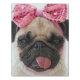 Pug dog with tongue out with a sequined pink ribbon, white background.