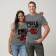 My 11 yo wore adult XL (5’7” 165#). The 8yo is small framed. She wore adult small and tied it in the back. Grandma wore adult large with long sleeve shirt underneath. Tall girl adult medium. Dark haired male adult large. Good quality dark Heather gray, Gildan brand shirt. -it was next up from basic choice and cost about $20 per shirt. Not too thick or thin. Washed and dried well, no major shrinkage. Not see-through. Can wear a bra under it fine. Screen print is just as shown and well done, front and back.