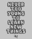 Motivation Phrase on Front and Back Sides of T-Shirts with quote: "Never Too Young To Learn New Things". Back image is customisable.